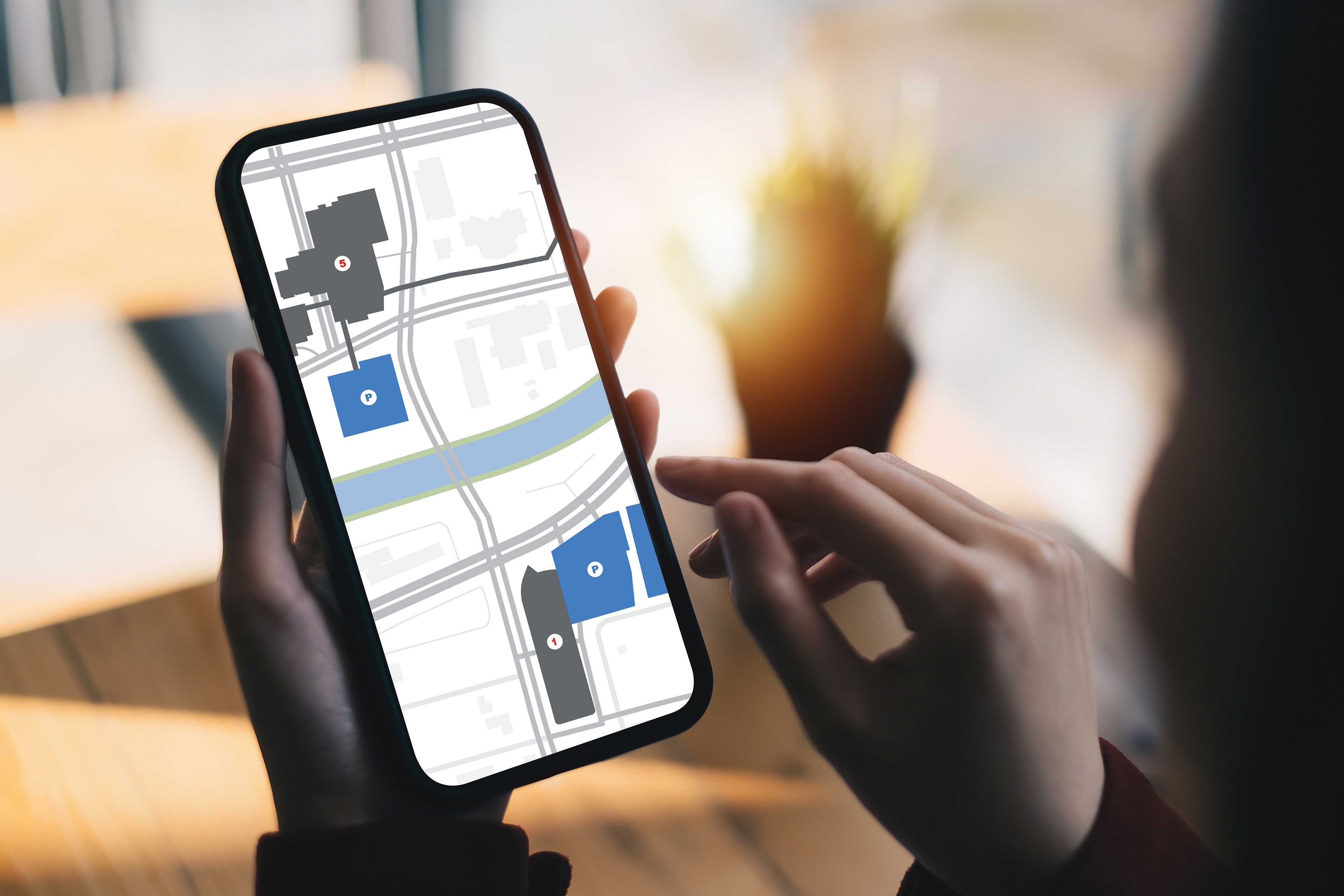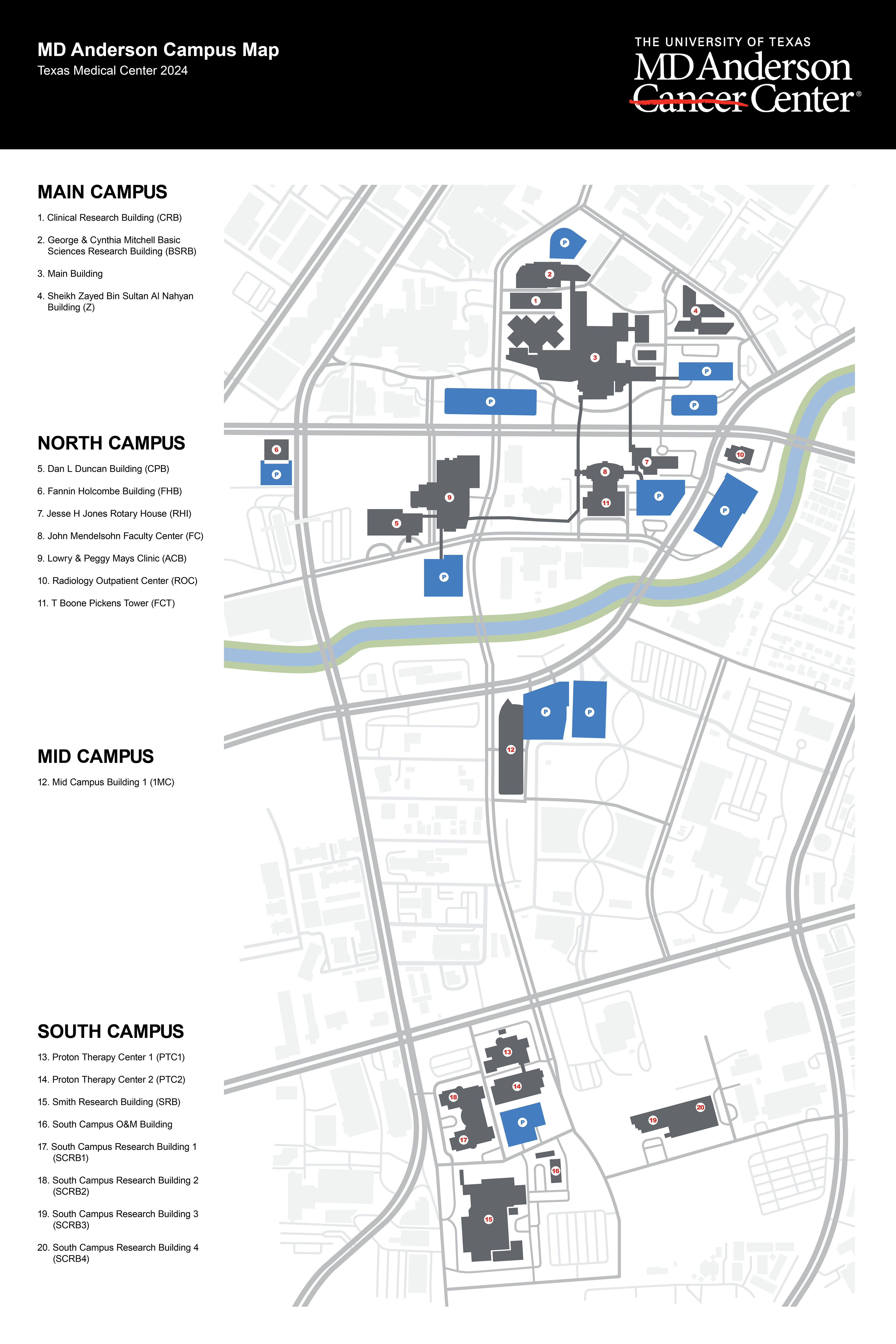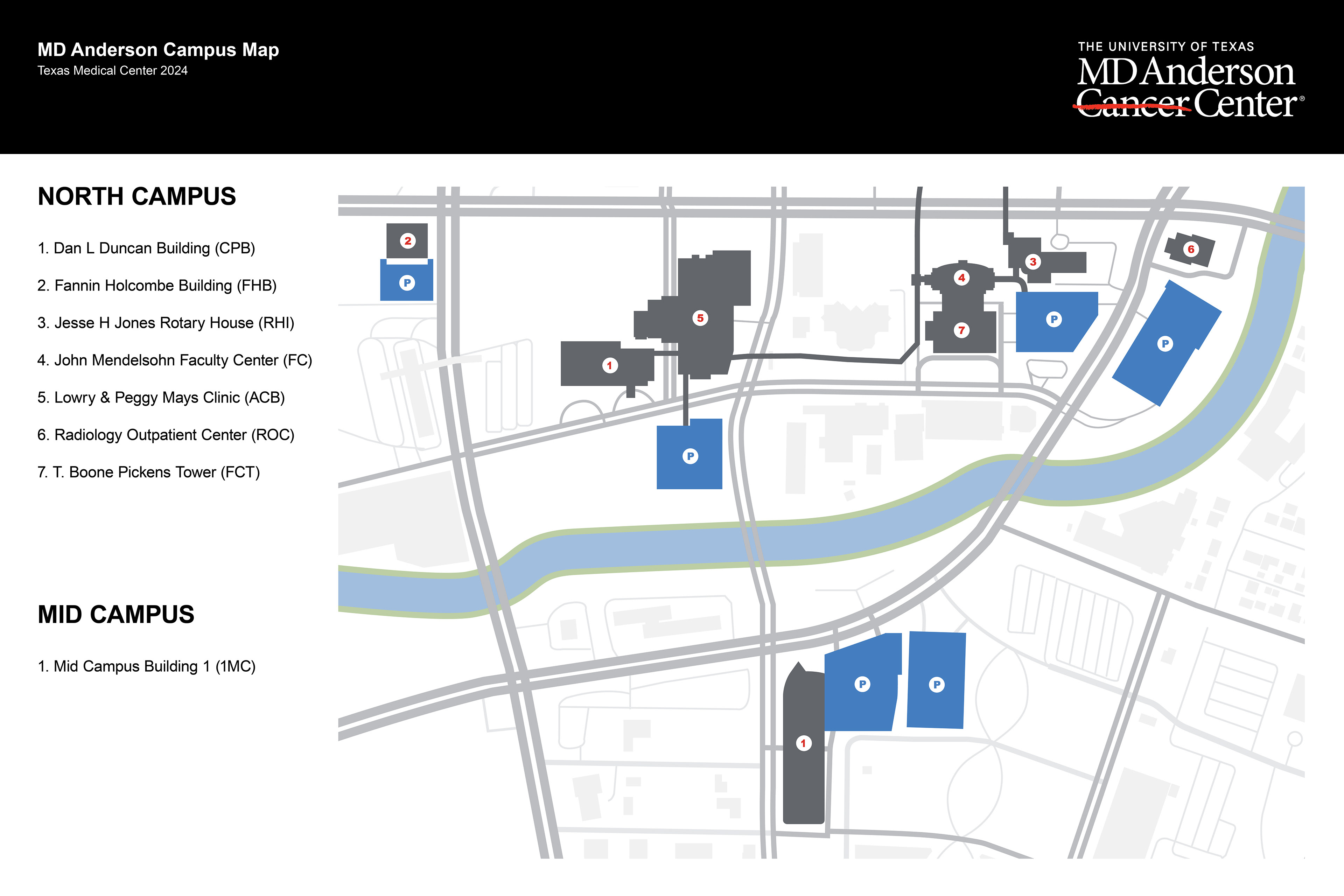 Asked: Develop a comprehensive campus mapping solution for MD Anderson’s Texas Medical Center location that identifies individual buildings and parking assets across a full-campus map and three focused regional maps: north, mid, and south campus.